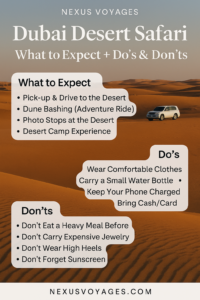 A Dubai Desert Safari is one of the most exciting things to do in the UAE. It’s perfect for first-time visitors, couples, and families. You get a mix of adventure, desert views, and cultural entertainment—usually ending with a BBQ dinner at a desert camp. With Nexus Voyages, your safari is planned to be smooth, safe, and stress-free.