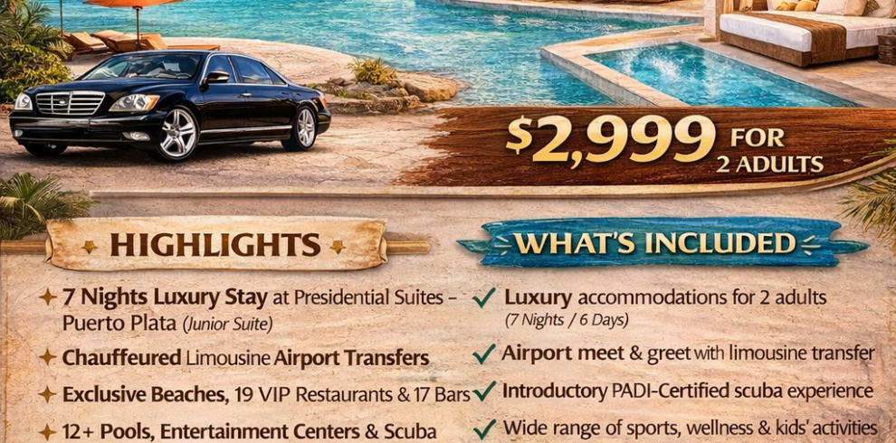 The Opulent Horizon Escape offers a refined all-inclusive experience designed for travelers who seek comfort, exclusivity, and effortless luxury. From the moment you arrive, enjoy seamless private round-trip transfers with chauffeured limousine service to and from Puerto Plata (POP) Airport, along with complimentary transportation within the Dominican Republic to shopping malls, attractions, and special events.