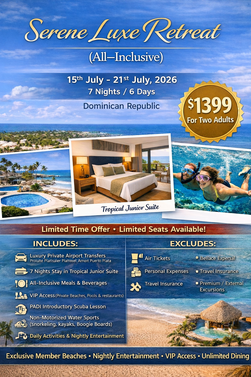 Serene Luxe Retreat (All-Inclusive) is an exclusive luxury escape set in the beautiful Dominican Republic, offering a perfect blend of relaxation, adventure, and premium hospitality. This 7 Nights / 6 Days getaway runs from 15th July to 21st July 2026, priced attractively at $1399 for two adults, making it an incredible value for a fully loaded all-inclusive experience. Guests will stay in a stylish Tropical Junior Suite at the elegant Serene Luxe Retreat, designed to provide comfort with a tropical ambiance.
